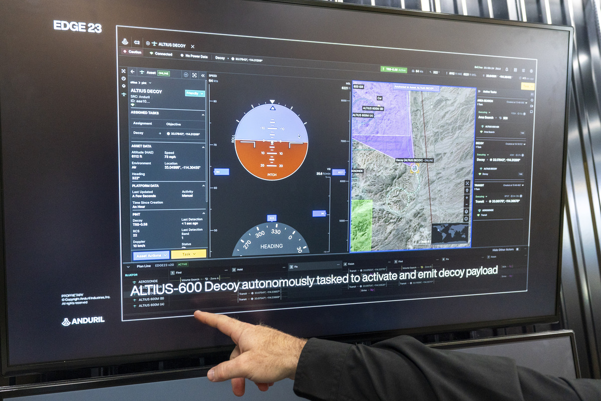 Lattice Mission Autonomy software by Anduril is demonstrated at the Air & Space Forces Association Air, Space & Cyber Conference, Wednesday, Sept. 13, 2023, in Oxon Hill, Md. Anduril and competitor Shield AI are each backed by hundreds of millions in venture capital funding. Both have a software-first approach and have obtained uncrewed drones in acquisitions or partnered with aircraft makers. (AP Photo/Alex Brandon)